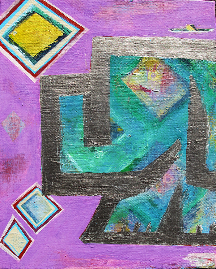 ○タイトル : 子像とUFO○製作年 : 2013○サイズ : 33.3cm×24.2cm キャンバス○画材 : アクリル絵の具○エピソード : 像の上にはUFOがいるシリーズ