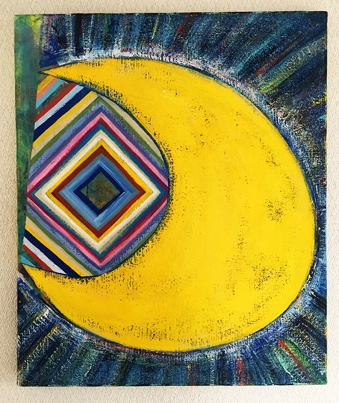 ○タイトル : 月と噐 ○製作年 : 2017○サイズ : 45.5cm×38.0cm キャンバス○画材 : アクリル絵の具○エピソード : 沖縄北谷の炭火串焼き月と噐の10周年に描かせてもらいました。料理も美味しく、staffも雰囲気も素敵な海の近くのお店なんで是非行ってみて下さい。