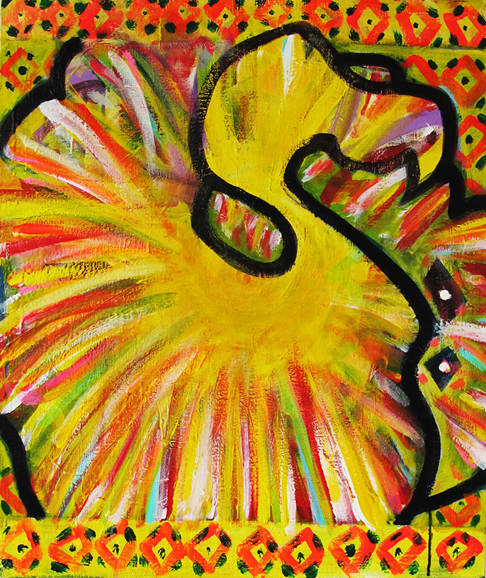 ○タイトル : 火の鳥○製作年 : 2012○サイズ : 65.2cm×80.3cm キャンバス○画材 : アクリル絵の具○エピソード : 花から生まれた火の鳥