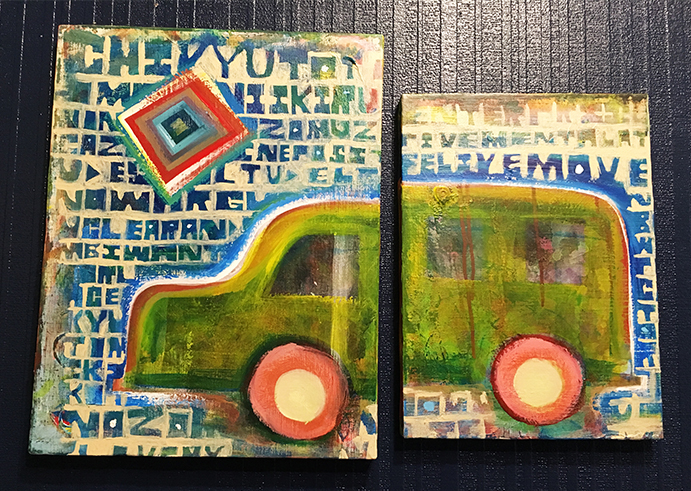 ○タイトル : フリー エネルギー カー○製作年 : 2016○サイズ : 53.0cm×45.5cm 33.3cm×24.2cm キャンバス○画材 : アクリル絵の具○エピソード : 欲しい車