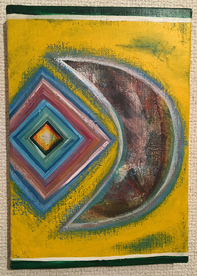 ○タイトル : グッドタイムーン○製作年 : 2016○サイズ : 22.7cm×15.8cm キャンバス○画材 : アクリル絵の具○エピソード : 輝きをいつもありがとう