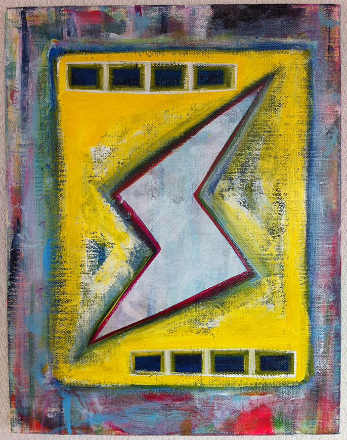 ○タイトル :イカズチ○製作年 : 2015○サイズ : 41cm×31.8cm キャンバス○画材 : アクリル絵の具○エピソード : いつもは太陽の周りに小さいのを描いてたが、今回はデカいイカズチを気持ちよく描いてみた。
