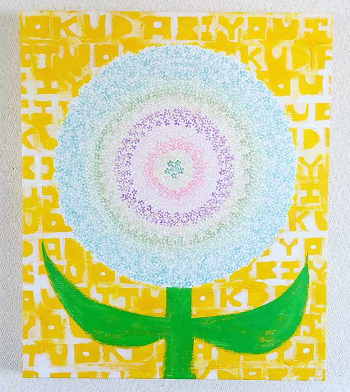 タイトル :INBROOM 奥田美容室ver ○製作年 : 2022○サイズ : 45.5cm×38.0cm キャンバス○画材 : アクリル絵の具 & マーカー○エピソード : 長崎県のスケーターで美容師のアッキー、彼女が独立して開業した奥田美容室に飾るためにYOKOと描いた作品。 まさに開花です。