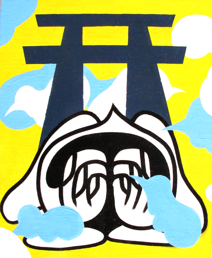 ○タイトル : おめでとうおかも○製作年 : 2010○サイズ : 33.3cm×24.2cm キャンバス○画材 : アクリル絵の具&油性マジック○エピソード : おいでやすの進化系、友人の結婚祝いの贈呈品