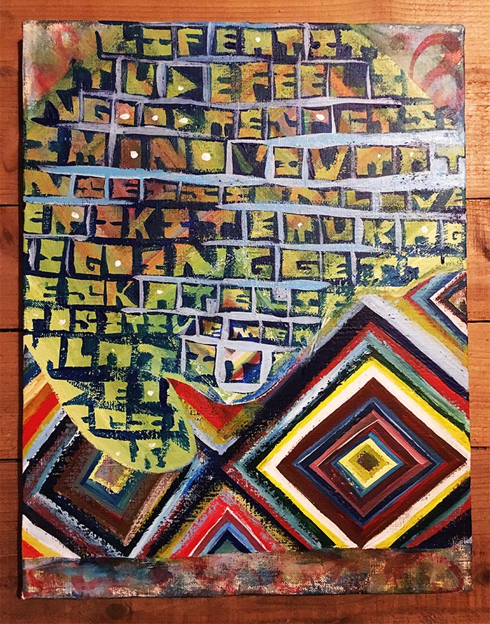 ○タイトル : 水面下から狙うサイ○製作年 : 2016○サイズ : 41cm×31.8cm キャンバス○画材 : アクリル絵の具○エピソード : 水面下から狙うサイ