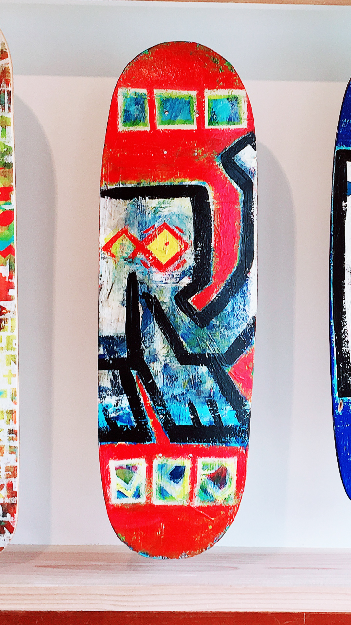 ○タイトル : オリジナルクルーザー○製作年 : 2018○サイズ : 7.5×31inch ○画材 : アクリル絵の具○エピソード : オリジナルシェイプ、オリジナルペイントクルザー (JAHI ART SHOW2018 at LITOMUS HOUSE)