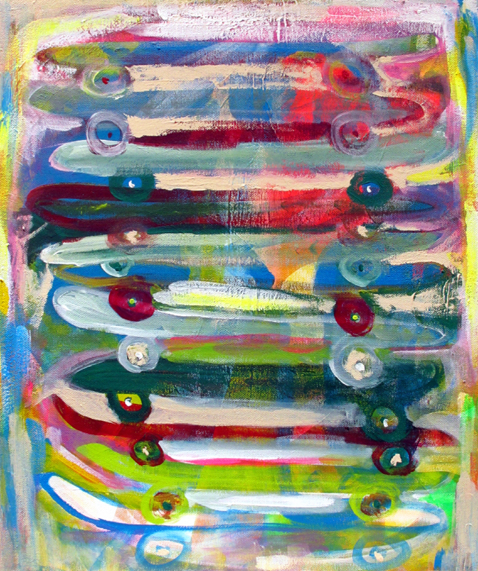 ○エピソード : スケートボードを始めたころにファインって雑誌でミット君が板11枚を跳んで日本記録を更新した記事を見た。その時のインスピレーションが時を経てキャンバスへ。
